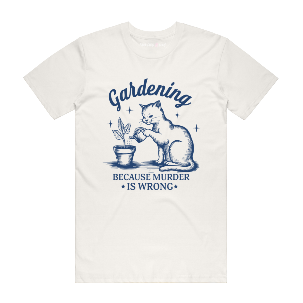Show off your quirky gardening spirit with this playful tee featuring a mischievous cat and the cheeky slogan, “Gardening Because Murder is Wrong.” Perfect for those who find gardening both a passion and a hilarious way to keep calm, this shirt blends humor and a love for plants in one comfortable, eye-catching design. Ideal for lightening up your garden days or sparking smiles wherever you go.